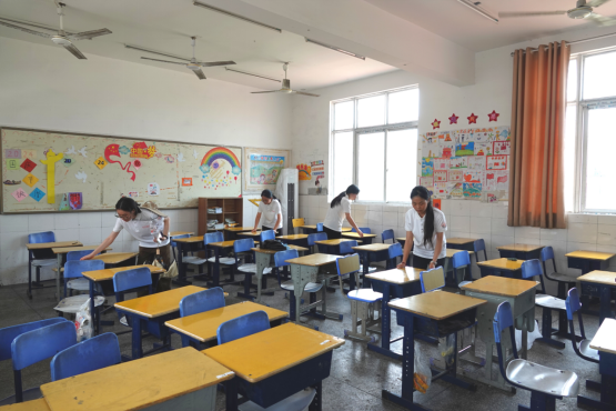 公司的嘱托深抵志愿者的心中,当天到达目的地后,志愿者们在郎君镇政府和社区工作人员的帮助下,清点教具和行李,迅速收拾好住处后,便前往教学场地进行打扫布置工作,为明日的开营仪式做充分准备。当志愿者们抵达郎君镇中心小学时,兰董事长与田董事长与志愿者们展开了亲切谈话,热情介绍公司的教学设施、设备,帮助志愿者熟悉校园办公,并表示将给予志愿者们帮助与支持。