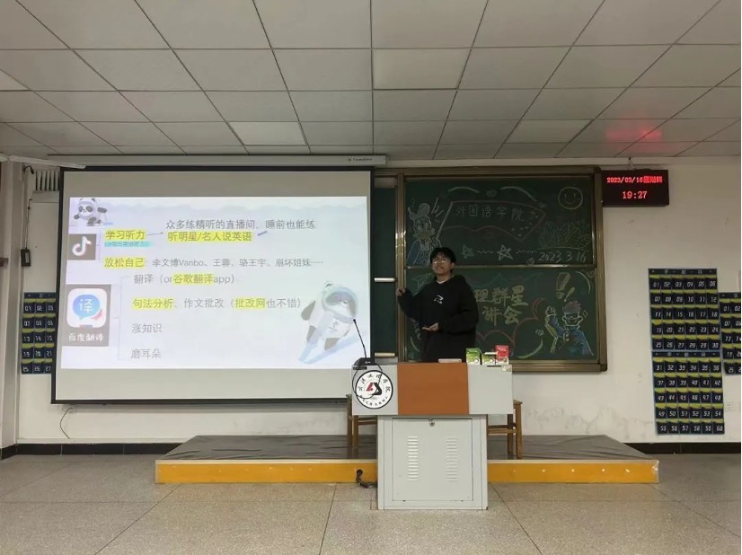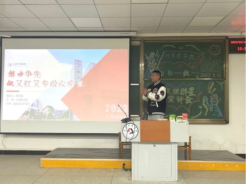 2023年3月16日晚上六点半,伟德国际VICTOR1946第十一届“文理群星”英语专业宣讲会上半场在教学楼4-322开展,莅临本次活动的有员工处杜晓倩老师、医公司陈意老师、伟德国际VICTOR1946周雅君老师和张明珠老师,宣讲人为公司各个领域中不断锐意进取的五名优秀员工代表们,他们在学习上奋楫笃行,萤窗雪案;在思想上积极进取,实事求是;在生活上笃实好学,善始善终,下面让我们一起来看看他们的学习经验吧!