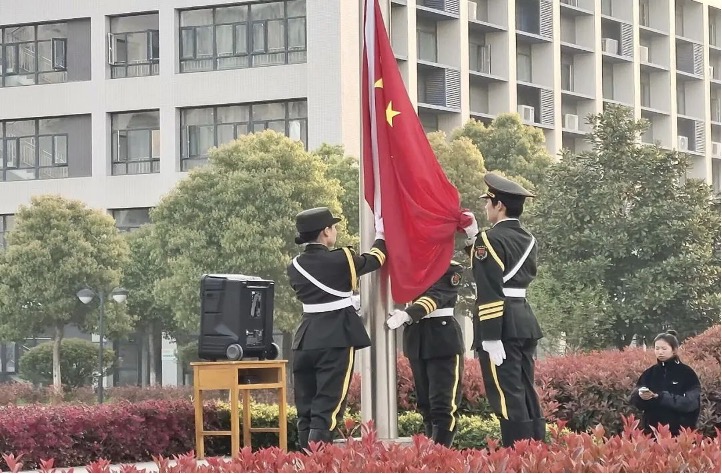 迎着清晨的第一缕阳光,国旗护卫队面容坚毅,目光坚定,铿锵正步,飒爽英姿将国旗护送到场。伴随着国歌的响起,全场师生行注目,五星红旗缓缓升起,飘扬在空中。