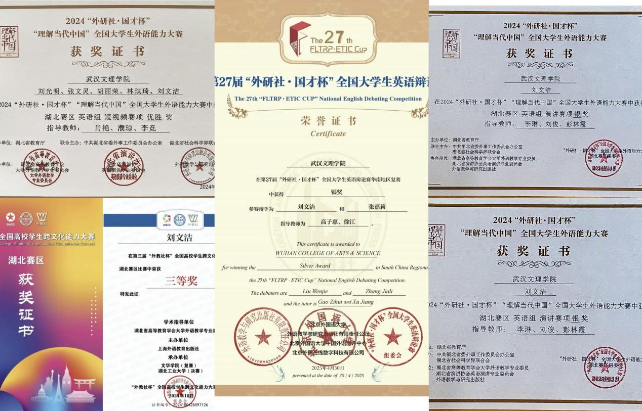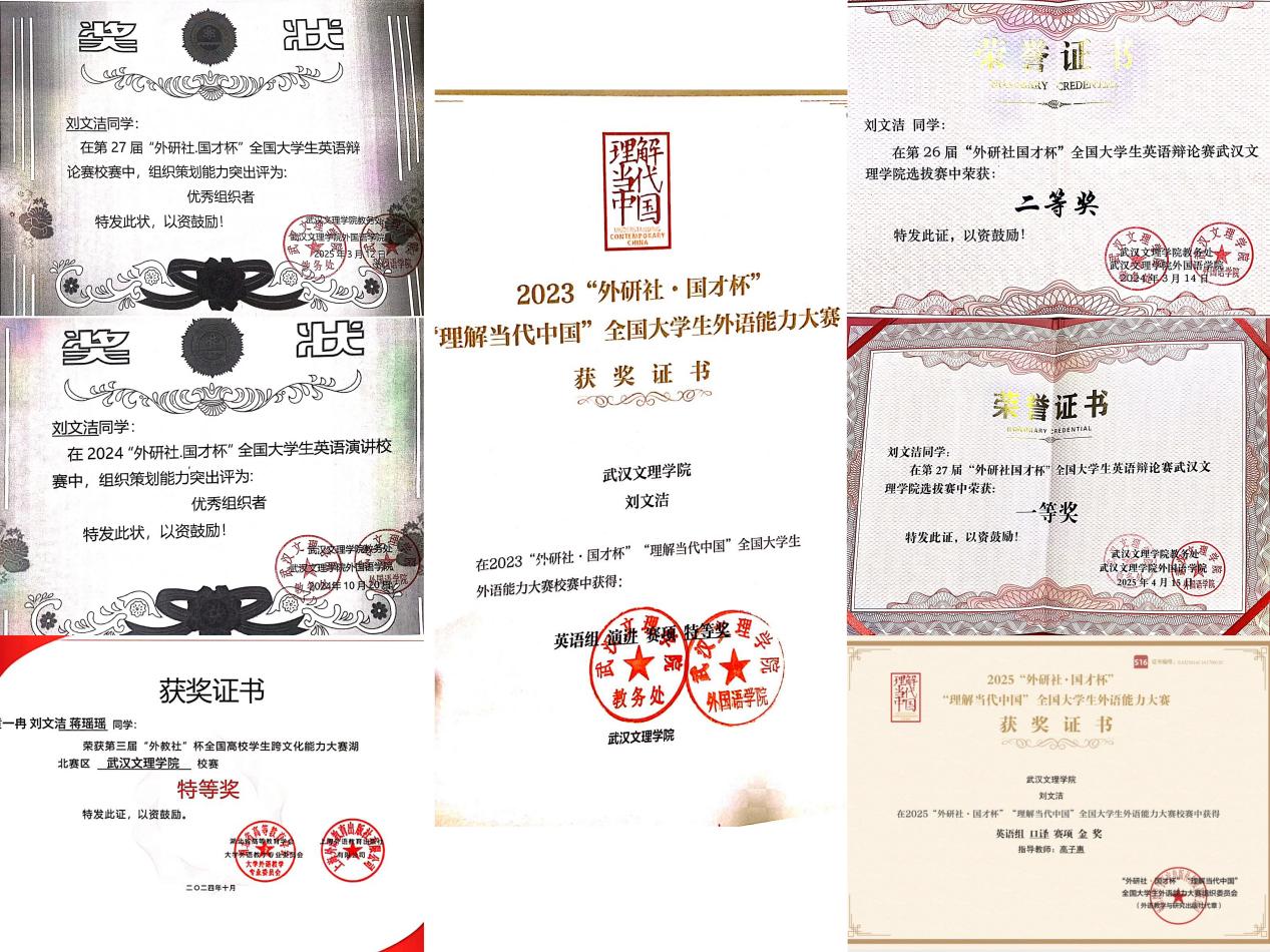 她更是践行“知行合一”的典范。在各类学科竞赛的舞台上,她将课堂所学的结构框架、逻辑论证与语言技巧运用得淋漓尽致。从外研社演讲、辩论赛的校赛金奖到省赛银奖,从跨文化能力大赛到口译赛场,她一步一个脚印,屡创佳绩。她坦言,竞赛之路充满未知,但每一次备赛都是知识的融汇与能力的升华,尤其是日复一日的大量口语输出训练,为她在各项赛事中的从容发挥奠定了坚实基础。