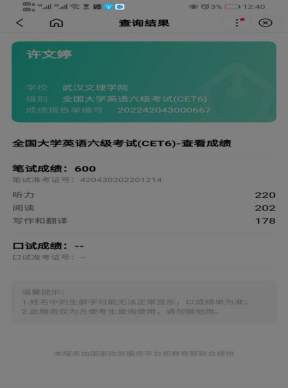 在2020年12月12日举行的全国大学英语四六级考试中,公司员工取得了突破性好成绩!自查分以来,不断有好消息传出,其中19级医学影像技术专业的许文婷同学,成绩优异,在本次六级考试中取得了600分的高分。