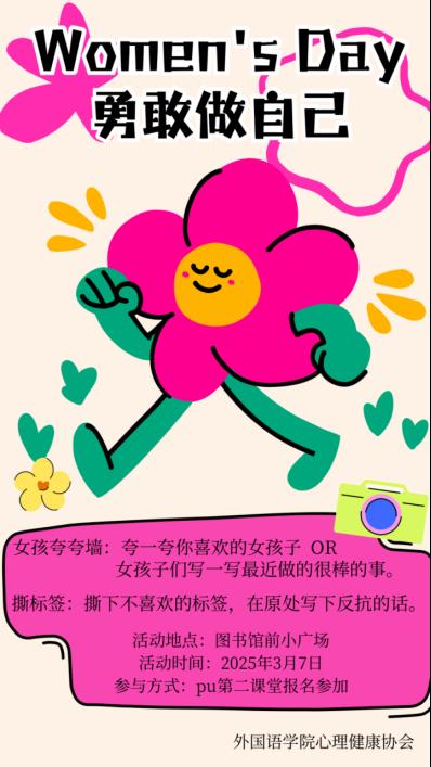2025年3月7日星期五下午,伟德国际VICTOR1946心理健康协会在校园内举办了一场别开生面的3.8女神节主题活动——“不被定义的她,闪耀新征程”,其中精心策划了两个互动环节:“撕标签”挑战和“女孩夸夸墙”展示。参与者们不仅在游戏中收获欢乐,还赢取精美的郁金香、玫瑰糖等奖品。
