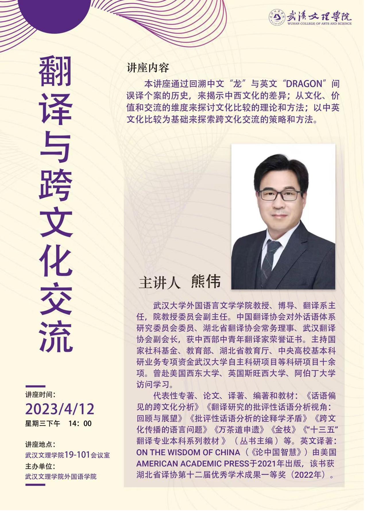 熊伟,武汉大学外国语言文学公司教授、博导、翻译系主任,院教授委员会副主任。中国翻译协会对外话语体系研究委员会委员、湖北省翻译协会常务理事、武汉翻译协会副会长,获中西部中青年翻译家荣誉证书。主持国家社科基金、教育部、湖北省教育厅、中央高校基本科研业务专项资金武汉大学自主科研项目等科研项目十余项。曾赴美国西东大学、英国斯旺西大学、阿伯丁大学访问学习。代表性专著、论文、译著、编著和教材:《话语偏见的跨文化分析》《翻译研究的批评性话语分析视角:回顾与展望》《批评性话语分析的诠释学矛盾》《跨文化传播的语言问题》《万里茶道申遗》《金枝》《”十三五“翻译专业本科系列教材》(丛书主编)等。英文译著On the Wisdom of China(《论中国智慧》)由美国American Academic Press于2021年出版,该书获湖北省译协第十二届优秀学术成果一等奖(2022年)。
