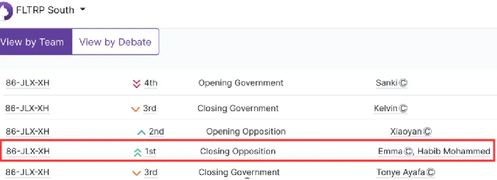 BP辩论赛制并无充足的准备时间,十分考验辩手的语言素养与知识储备。每场比赛公布辩题后仅有十五分钟的准备时间,并且辩手需要在七分钟内完成立论、反驳、总结等任务,压力极大。巡回赛赛制时间过于紧张,约一天半的时间中连续进行五场比赛,对辩手的身体素质与心理素质是个不小的考验。每场比赛结束后裁判公布排名,当场比赛的成绩难免对下场比赛的心态产生影响。比赛的分组与辩位为随机抽取,不确定性大,角色的不同也会影响选手的发挥。在这次比赛中,计龙祥和许晗同学的专业素养与抗压能力得到充分展现,虽然开场发挥受限,冲劲却一往无前,越战越勇,渐入佳境。