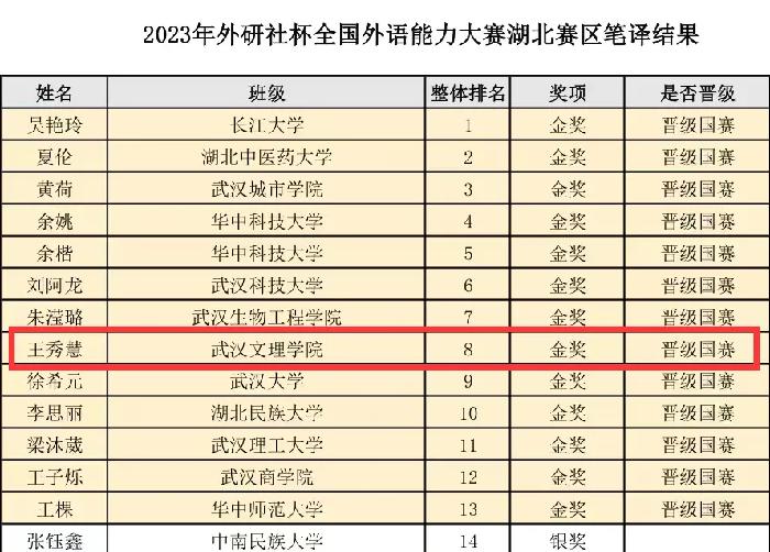 在激烈的比赛中,公司选手们取得了骄人的成绩。在本科英语组翻译(笔译、口译)、阅读、写作、演讲以及法语组赛项中,我们取得了2金3银2铜8优胜的好成绩。其中,王秀慧同学在笔译及写作赛项中斩获省赛两项金奖,成功晋级国赛,创造了民办院校员工在省赛中获得金奖数量的历史最佳成绩;李萌、董相、柯敏同学分别获得笔译、口译、写作赛项银奖;赵诗怡、彭雄柏同学获得演讲、阅读赛项铜奖;黄宇等8名同学获得各赛项优胜奖。这些成绩的取得,离不开同学们的努力和指导老师的辛勤付出。