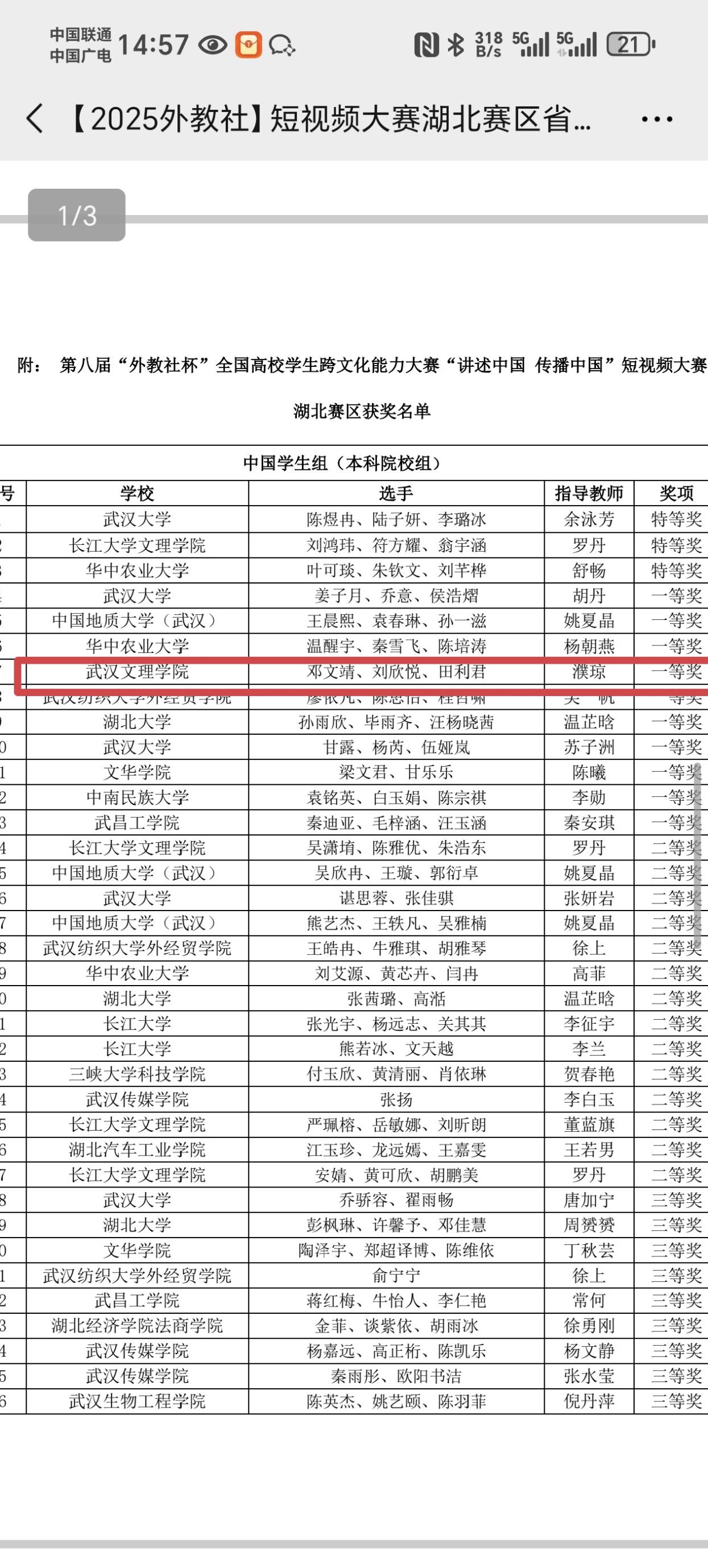 近日,第八届“外教社杯”全国高校员工跨文化能力大赛“讲述中国 传播中国”短视频大赛全国赛获奖名单公示,公司伟德国际VICTOR1946邓文靖、刘欣悦、田利君三名同学组成的团队再创佳绩。该团队此前斩获湖北赛区省级一等奖,成功入围国赛,此次凭借《武当武术的自然哲思与卢梭自然教育观的跨时空对话》荣获中国员工本科院校组全国二等奖。