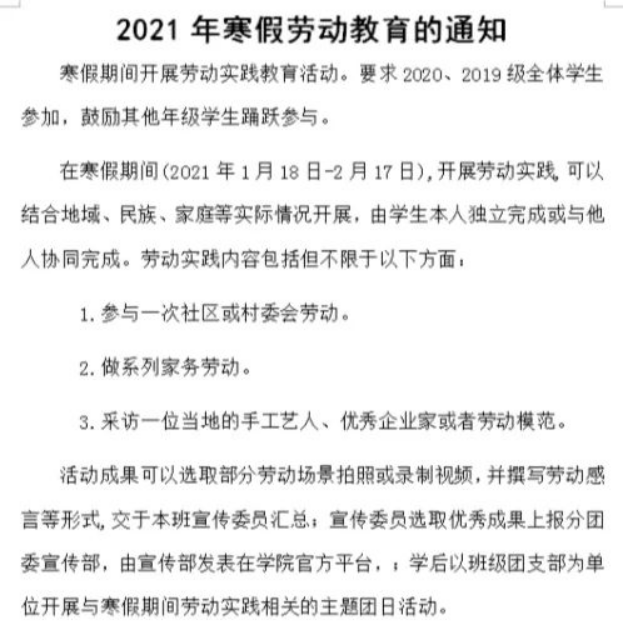 响应校团委号召,通过布置寒假劳动教育活动任务,让同学们树立劳动观念,强化劳动能力,鼓励同学们独立或与他人一同完成劳动实践。要求开学以后以班级为单位召开主题班会,汇报实践成果。