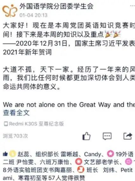 通过学习强国app等官方平台寻找查阅选取党团相关知识的英文翻译作为学习内容,利用团委宣传栏QQ平台,每周发布两次学习内容,要求同学们关注学习,并准备于开学后5月就发布的学习内容组织竞赛,选取优秀学习标兵进行表彰。