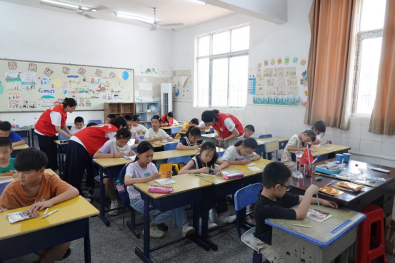 暑托班内,“锡纸刻文物”暑期课堂在郎君镇中心小学开课,小员工纷纷化身“小小考古匠”,在华韵心文化服务队的志愿者带领下,用指尖的温度与创意,将三星堆青铜面具、编钟、青花瓷瓶等国宝文物“复刻”在锡纸上,同时也增加了热门IP元素哪吒等喜闻乐见的元素。使同学们在趣味实践中触摸历史脉络,感受传统文化的魅力。