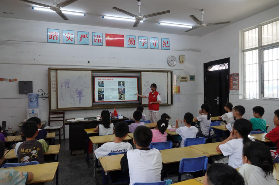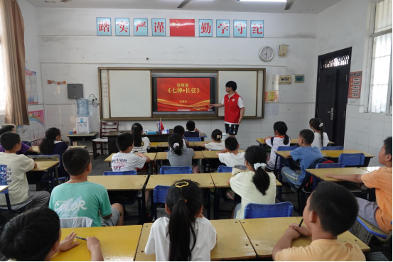 “提到毛泽东,同学们会想到什么?”红色诗歌朗诵的课堂上,志愿者的提问激活了孩子们的思考。从“伟大的革命家”到“气势磅礴的诗词”。热烈互动中,一段展现长征历程的影像缓缓播放。雪山草地的苍茫、红军战士嚼草根过沼泽的坚毅,让《七律·长征》的创作背景从文字变为可触可感的历史现场。