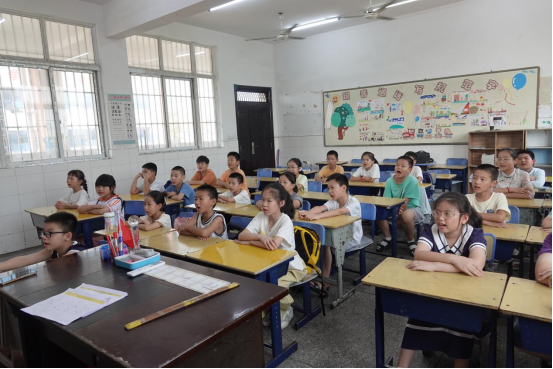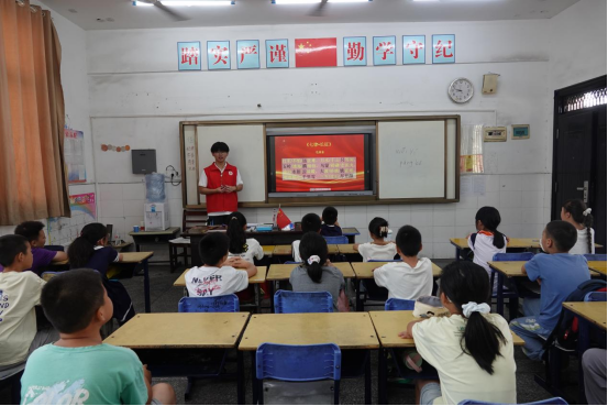 “红军不怕远征难,万水千山只等闲……”郎君镇中心小学暑托班的教室里传来了铿锵有力的诵读声,华韵心文化志愿服务队的志愿者以沉浸式教学法讲授毛泽东诗词《七律·长征》,通过历史影像、互动朗读等创新形式,让红色经典焕发时代光彩。