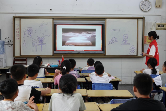 “两弹一星”精神宣讲课接续传递精神力量,让孩子们看到长征精神在科技领域的时代延续。志愿者巧妙衔接起两段历史,随后播放的影像中,火箭腾空的壮丽与戈壁科研人员顶风冒雪的场景交相辉映。