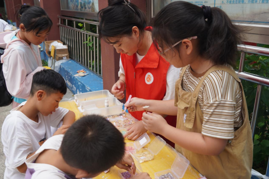 志愿者们的讲解让技艺不再遥远:“螺钿是古人用贝壳做的‘宝石画’”“绒花曾是宫廷里的装饰品”,简单的话语揭开非遗背后的历史故事,让孩子们在动手之余,更明白手中作品承载的文化重量,一幅幅美丽的作品通过孩子们的巧手被制作出来。